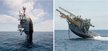 شیرجه باورنکردنی کشتی ۱۰۰ متری در آب / حالت عمودی غول فلزی در آب / عکس
