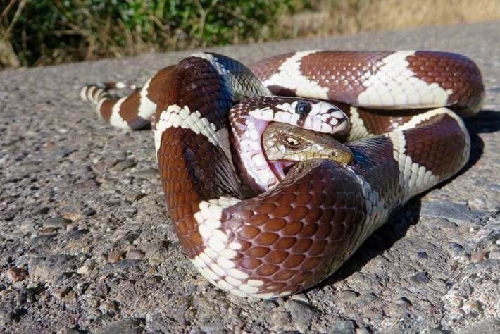 رنگ و طرح بدن شهمارهای کالیفرنیایی بسیار شبیه به مارهای مرجانی سمی است، اما شهمارها زهر کشنده ندارند.