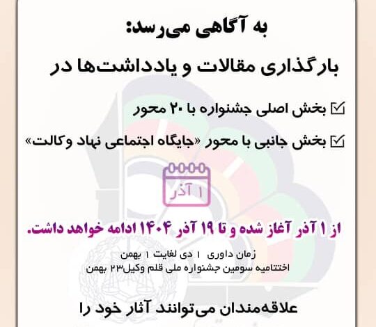 این فراخوان، به‌ویژه بر محوریت تعامل، مشارکت و بازتاب گسترده‌تر نقش نهاد وکالت در سپهر اجتماعی کشور تأکید دارد و از همه فعالان این عرصه دعوت می‌کند روایت خود را از جایگاه اجتماعی نهاد وکالت ارائه دهند.