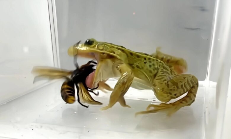 زنبورهای قاتل کابوس جانوران دیگر هستند؛ اما قورباغههای بیباک برکه آنها را یک لقمه میکنند