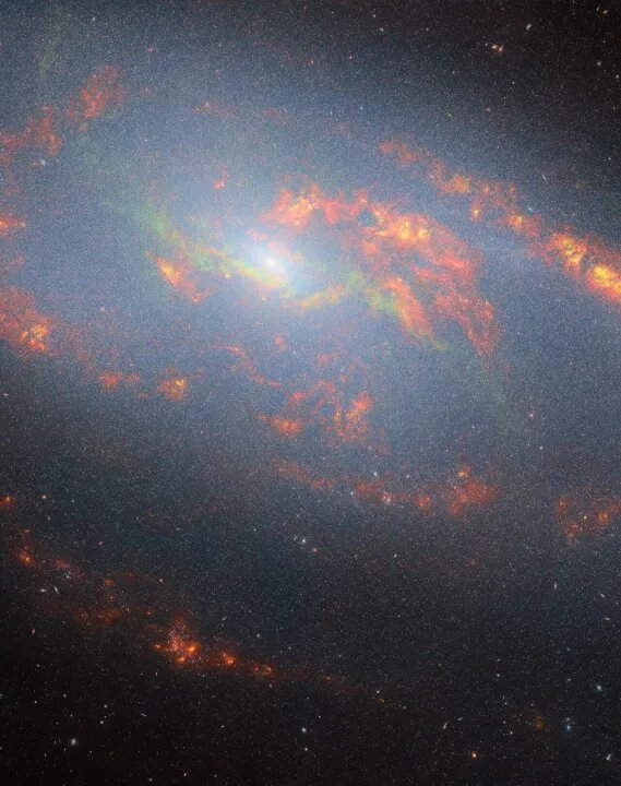 در نسخه کامل تصویر که با استفاده از دوربین مادون قرمز نزدیک وب (NIRCam) گرفته شده است، میتوانید هسته فعال کهکشانی را در مرکز به رنگهای سفید مایل به آبی مشاهده کنید که توسط مناطق نارنجی و قرمز احاطه شده است که گاز گرم را نشان میدهند. مناطق سبز و زرد بازوهای اضافی کهکشان هستند که در اثر خروج گازهای چشمگیر ایجاد شدهاند. همانطور که در نور مادون قرمز دیده میشود، مرکز کهکشان به خوبی میدرخشد، زیرا مادهای که توسط سیاهچاله خورده میشود، باعث میشود گاز به سمت آن به شکل مارپیچی حرکت کند و اصطکاکی ایجاد کند که آن را چنان داغ میکند که میدرخشد.